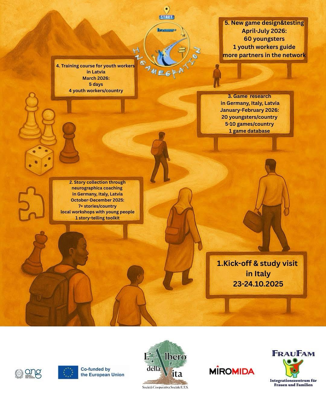 InGameGration è un progetto KA2 Small-Scale Partnership nell’ambito del programma Erasmus+, coordinato da L’Albero Della Vita (Italia) in partenariato con @fraufam_integrationszentrum e.V. (Germania) e Miromida (Lettonia). Il progetto mira a rafforzare le competenze degli operatori giovanili nell’inclusione dei giovani migranti attraverso l’apprendimento basato sul gioco e lo storytelling.